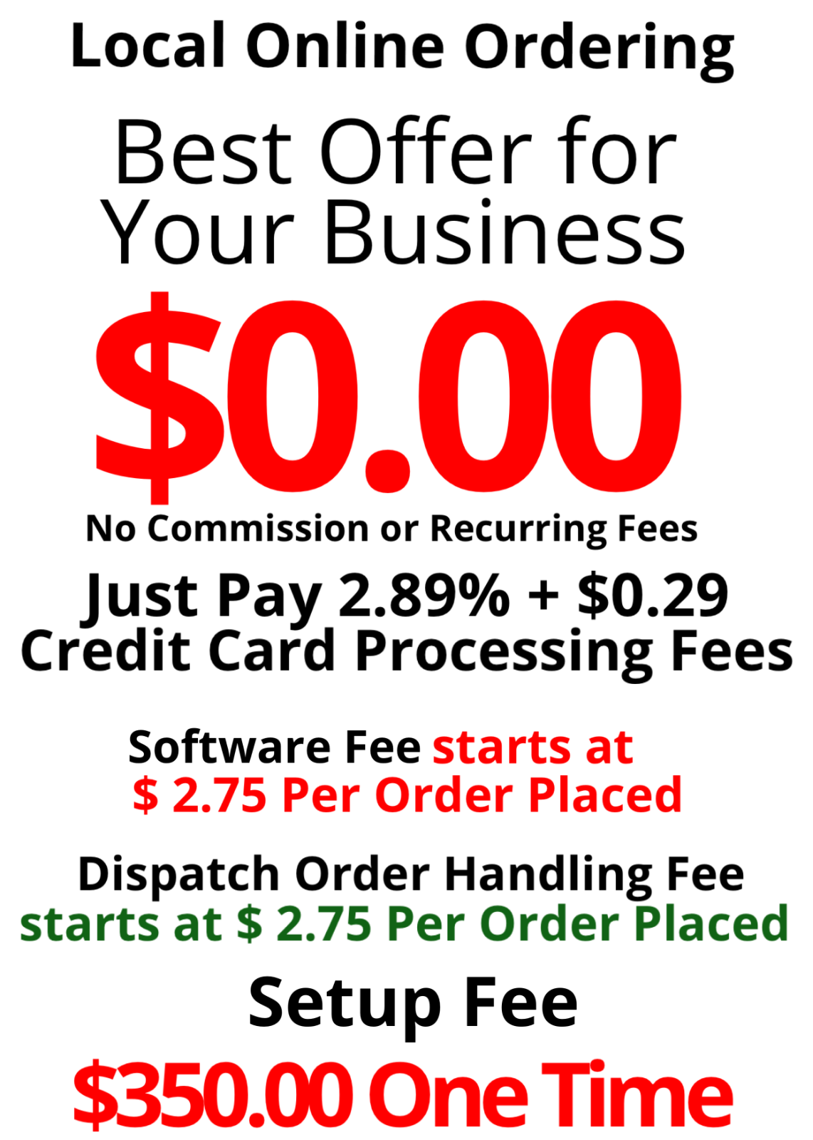 YES (INCLUDED) $2.75 per order. Starter Pricing Local Online Ordering Manages call in orders and delivery issues for your business.